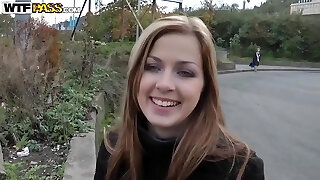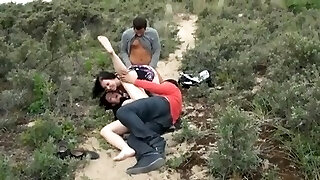 grandi tette dai capelli castani ottiene il suo sudato cootchie inghiottito e gobba in pubblico trail