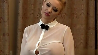 big boobed cutie vestito sontuoso di polizia in uniforme e calze ottiene il suo squarcio che si incunea azienda