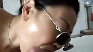 Asian dame with sunglasses sucks cock, while getting fingered.